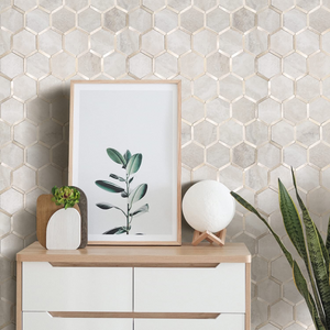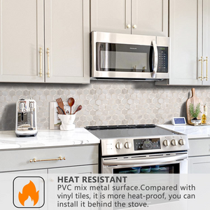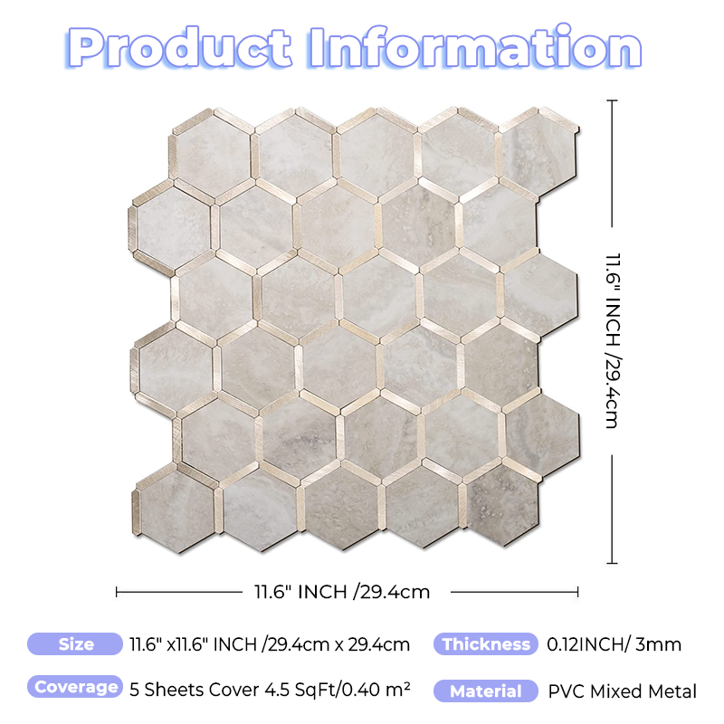 About Hexagon Backsplash:Add a touch of playful elegance to your space with our Hexagon Faux Stone Mixed Metal tile. The marble and metal combo creates a unique, eye-catching design that's perfect for any room. Easy to install, this tile brings a chic and elegance vibe to your home.