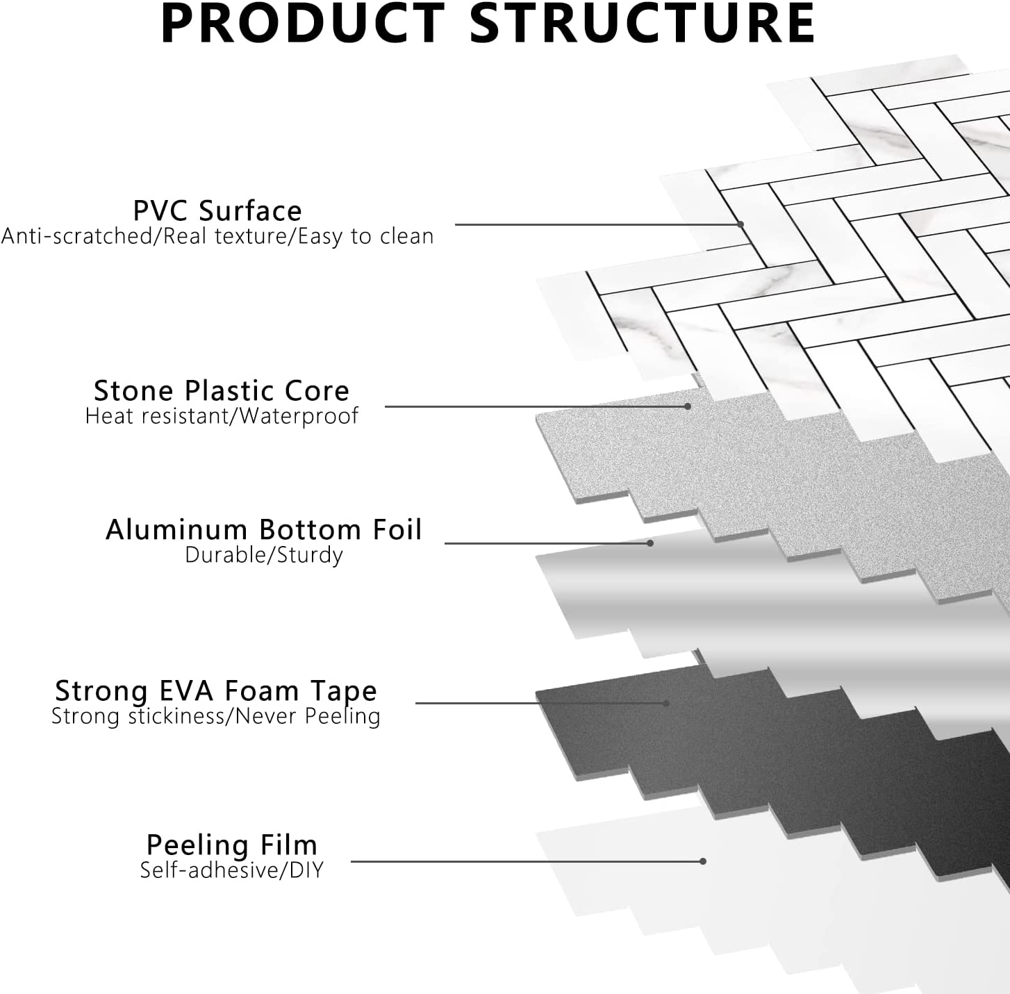 - HIGHLY ADHESIVE& HEAT RESISTANT: Strong backing adhesive which is 3 times stronger than ordinary vinyl-backed tiles. The self adhesive wall tile stickers feature color fadeless ,waterproof, heat and impact resistance, easy to wipe down and remove the stain.