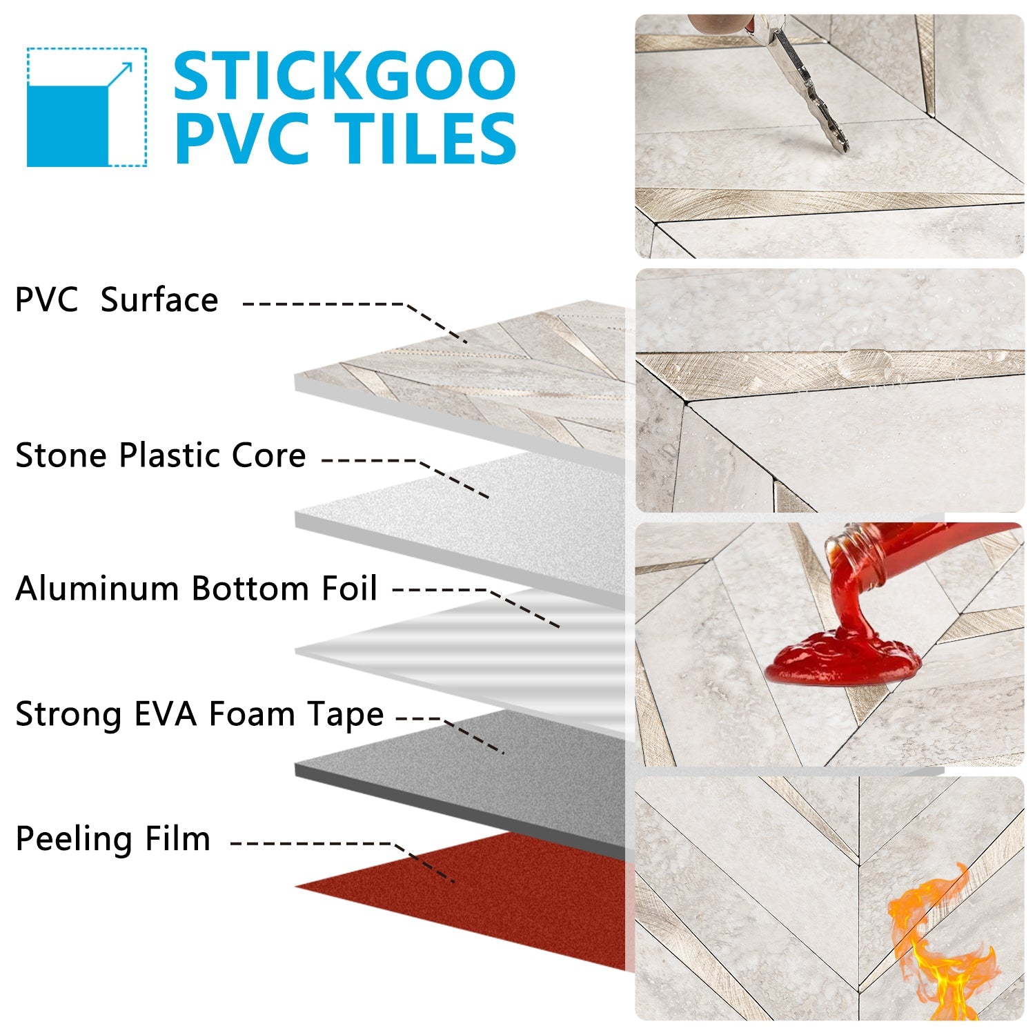 - SIZE: 10 sheets self adhesive PVC tiles, 12'x12'x0.12' each, cover about 7.7 square feet. Please consider cutting loss 3-5% in every DIY project.