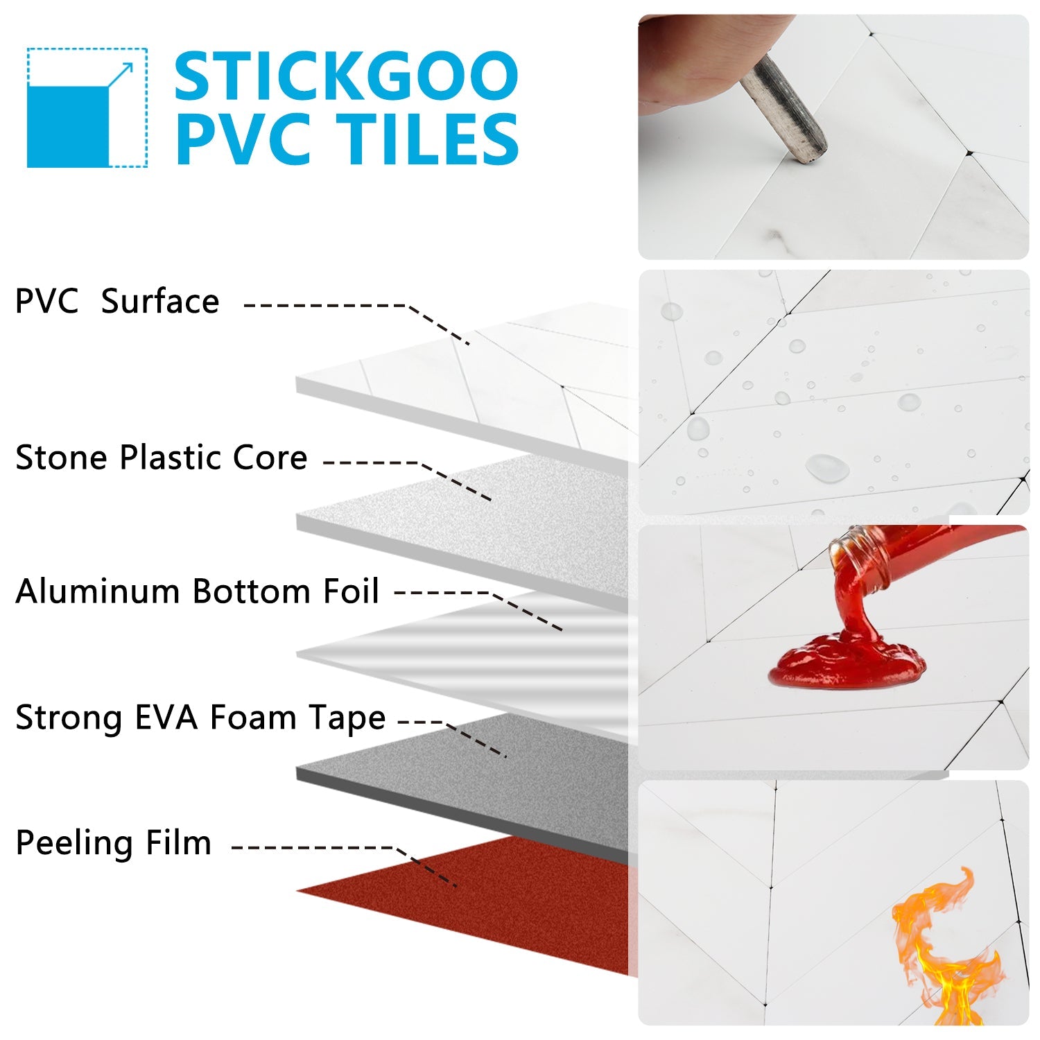 - SIZE: 10 sheets self adhesive PVC tiles, 12'x12'x0.12' each, cover about 7.7 square feet. Please consider cutting loss 3-5% in every DIY project.