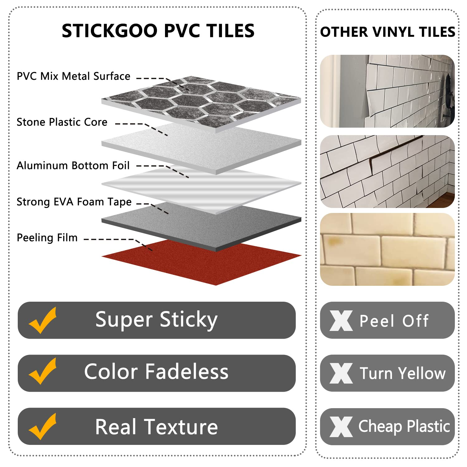- Waterproof & Heat Resistant: Made of PVC composite laminate, color fadeless, anti-scratch. Seamless design keeps stains out and easy to clean. Stronger and more durable than plastic self-adhesive tiles.