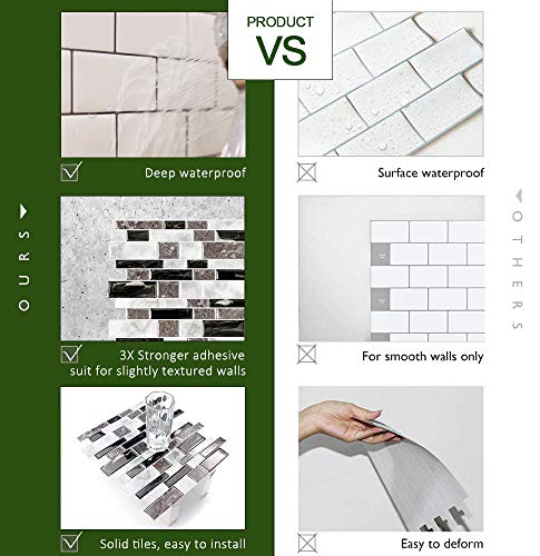 - ❁Stronger Upgrade Adhesive: 3X Stronger backing glue than ordinary vinyl backsplash tile, not only stick firmly to the smooth & clean surface, but also available on lightly textured wall