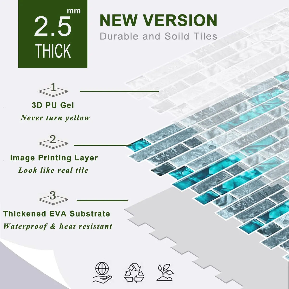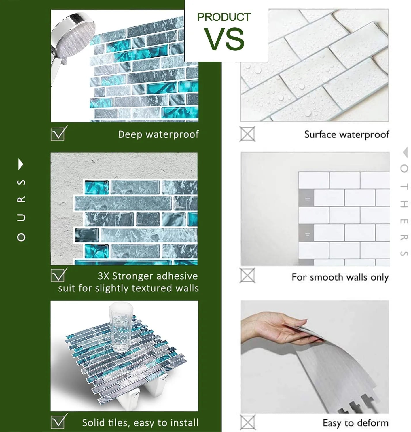 - ❁Stronger Upgrade Adhesive: 3X Stronger backing glue than ordinary vinyl backsplash tile, not only stick firmly to the smooth & clean surface, but also available on lightly textured wall