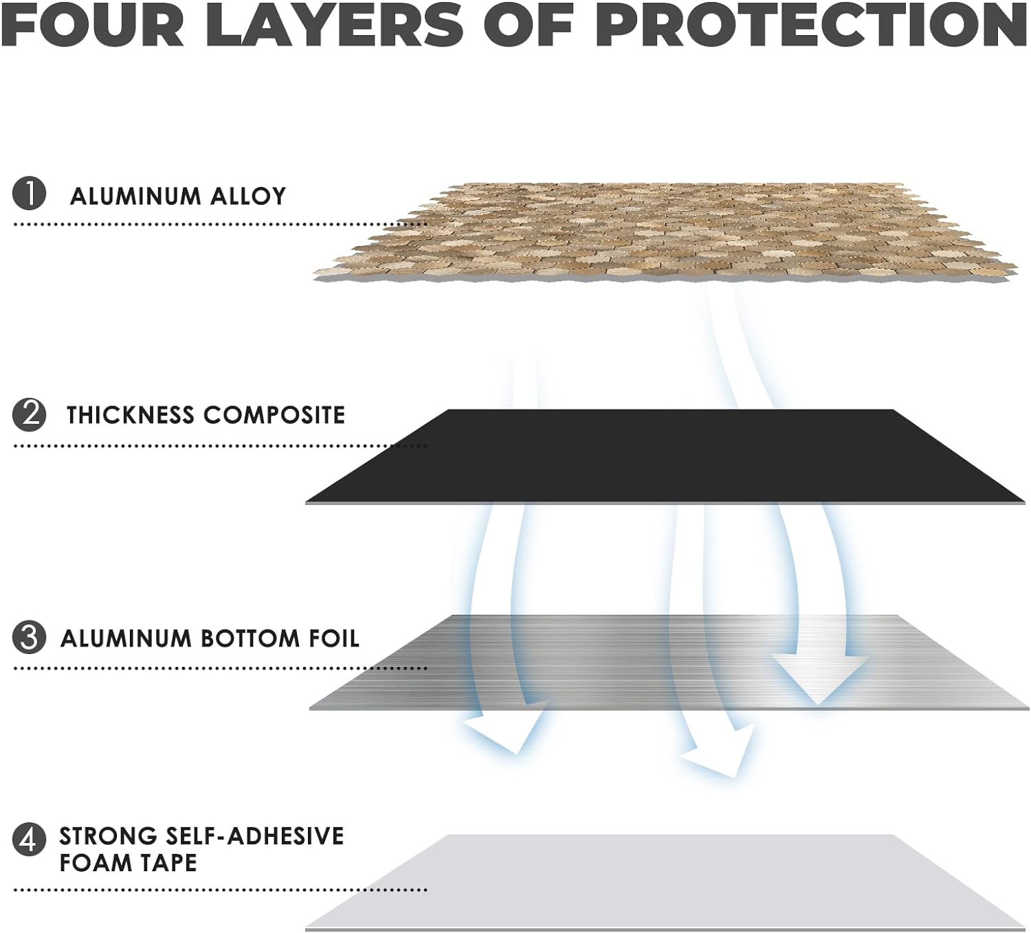 - Premium Features: Made with aluminum materials with an elegant metallic brushed shine. Heat-resistant and moisture-resistant, suitable for installation on almost any wall surface at home. Easily wipe off stains, protecting the wall from water splashes and grease. Enhanced adhesive backing and thickened design make it superior to regular PVC tiles, more durable than plastic self-adhesive tiles