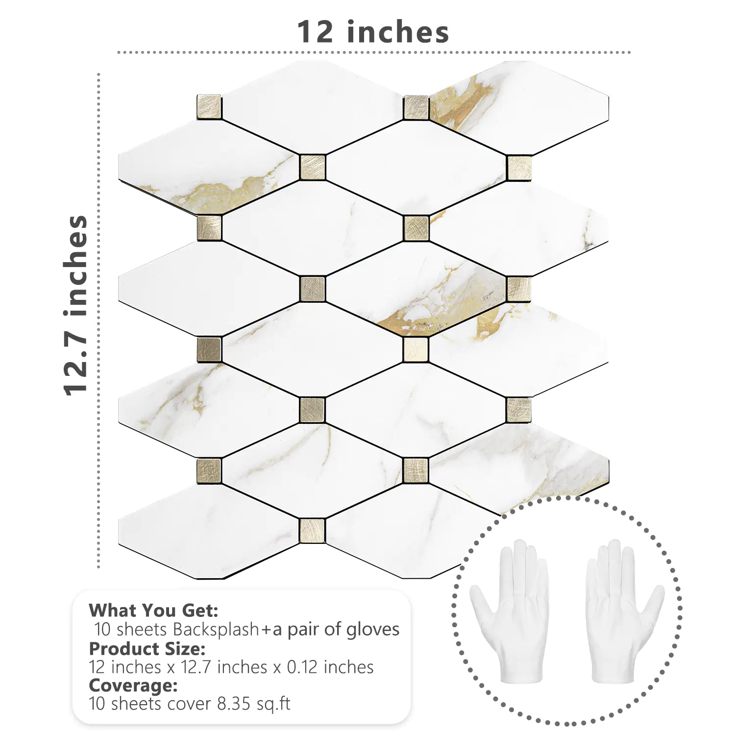 - SPECIFICATION: 10 sheets self adhesive PVC mixed glass tiles, 12.7'x12'x0.12' each, cover about 8.35 square feet. 3-5% extra wastage is recommended in every DIY project. An added BONUS: comes with a pair of gloves protect your hands from dirty and injury.