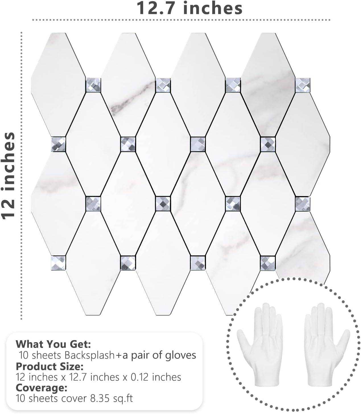 - SPECIFICATION: 10 sheets self adhesive PVC mixed glass tiles, 12.7'x12'x0.12' each, cover about 8.35 square feet. 3-5% extra wastage is recommended in every DIY project. An added BONUS: comes with a pair of gloves protect your hands from dirty and injury.