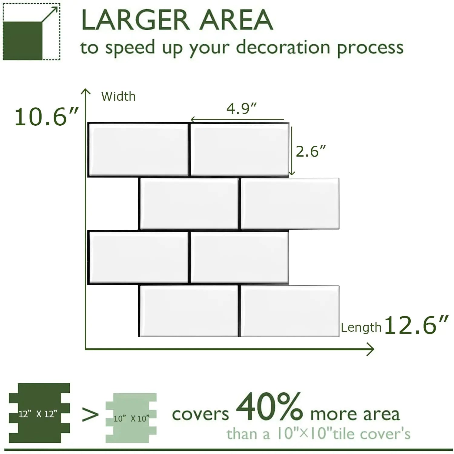 About Subway Backsplash:Transform your space into a sophisticated haven with our Subway Tile Peel and Stick Backsplash. Experience the ease and elegance of a quick installation, without sacrificing high-end style. Elevate your wall decor and upgrade your home the luxurious way.