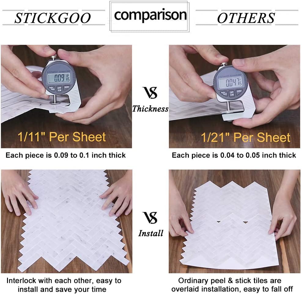 - ❁ Stronger Upgrade Adhesive: 3X Stronger backing glue than ordinary vinyl backsplash tile, not only stick firmly to the smooth & clean surface, but also available on lightly textured wall